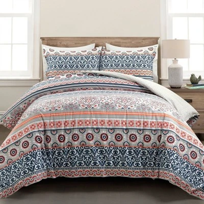 3pc Nesco Stripe Cotton Duvet Cover Set Navy/Coral/Gray – Lush Décor