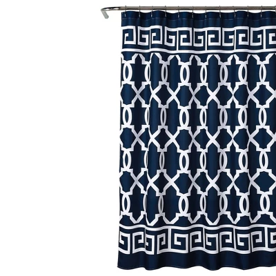 Shower curtain features an eye-catching, navy and white trellis pattern and a maze border at the top and bottom of the panel.